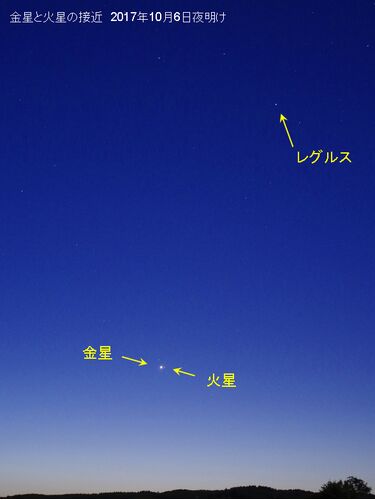 今朝は快晴!寒気も抜けてすっかり回復しています。 ただ・・晴れると内陸から吹き出す東よりの風が草木を揺らしています。 さて今夜は満月、昨夜も手元の明かり無しに普通に歩けるほど明るい外でしたが 今夜も、また明るい月夜です。 金星と火星の接近 10月…