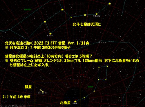 夕方から一時、我が家は雪が降りますが・・明日の未明は晴れるらしい ということで今夜月が沈むタイミングで彗星を写すための簡単な資料を作成! 35mm フル Ver 明日未明に彗星を 135mmで写すには 北極星をフレームの右下に入れると自動的にフレームの左上に…