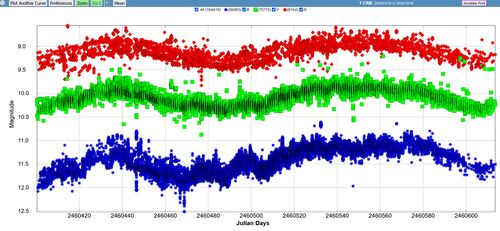 今日は晴れ時々曇り、今夜は彗星を撮れそうな気配も・・雲多し、どうなるか さて今朝の かんむり座 T です。 かんむり座 T ライトカーブ by AAVSO(~10/30 約200日間) 昨日みられた変化は継続中、紫外線域は増光傾向。。可視光域(緑)は、急上昇中?どう…