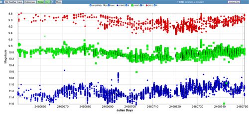 かんむり座 T が「まもなく」80年ぶりに急増光をするのでは?と云われているので 晴れた昨夜、写してみました。 かんむり座 と T 界隈の拡大 03月02日00時22分 135mm F5.6 2秒 固定 16枚合成 かんむり座 T ライトカーブ by AAVSO(~3/2 約80日間) 写したも…