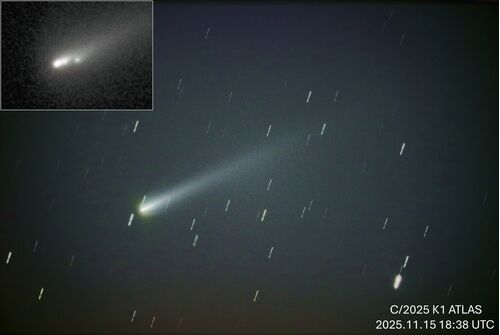 C/2025 K1 ATLAS 11月16日03時38分 ISO12800 20秒 16枚 核らしき基準合成 C14+れ 3I ATLAS 彗星 同日 04時39分 ISO12800 15秒 20枚合成 EVOSTAR 72EDⅡ 直 と云う事で、ようやく写すことが出来ました。 K1 ATLAS は何時までもつのでしょう・・怪しい噂が絶え…