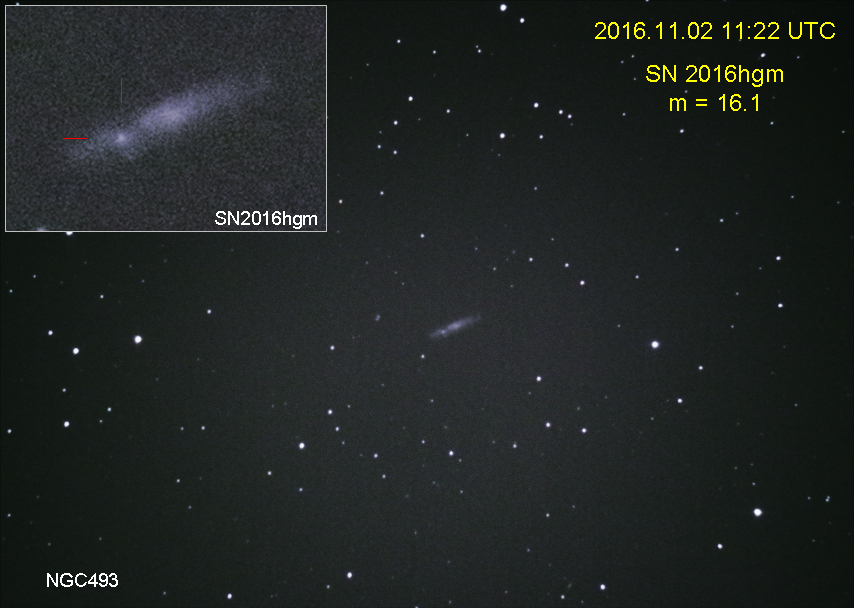雲が多い中で隙間を見つけては撮影し、手元のリストに沿って一つ、また一つ。。結局、この夜は新星を 2つ、超新星を 1つ、他に銀河を 2つ、そして星団・・。可能性があれば撮ってみる。ということで少しばかり貯金箱が増えました。さて、この銀河は、その超新星が発見された「くじら座」の NGC493。前の画像も、今回の画像も棒渦巻銀河と云われても・・な姿です。で、先回の画像に無い「キラリ」がありますね。目標としていた超新星は、まだ私の手の届く範囲だった様です。撮影中のオリジナルでも星を確認することが出来ました。16等級だと、そんな風に判別が可能な明るさなのです。それにしても立て続けに新星や超新星が発見されていて・・凄いな~と感心するばかりです。
