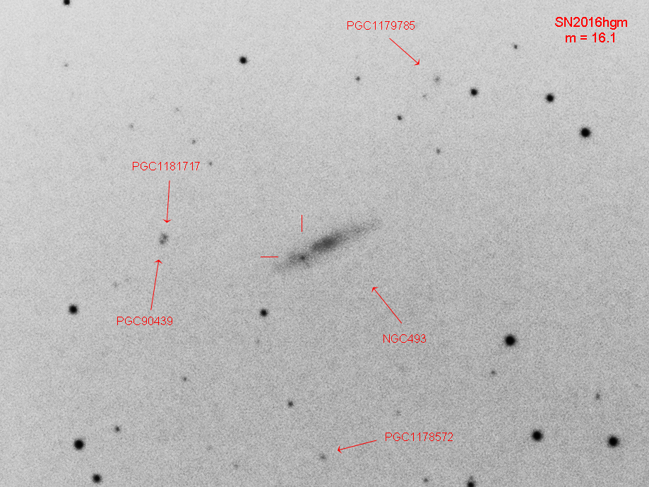 SN 2016hgm(赤縦横線の交点)11月24日18時43分 ISO6400 15秒 27枚合成 反転トリ