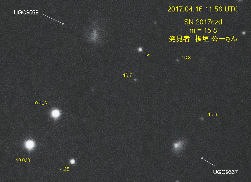 山形県にお住まいの板垣公一さんが 4月12日に発見された超新星(SN2017czd)を撮ってみました。正直なところ・・超新星が現れた銀河は、手元に用意した星図がなければ、写すことが出来ないほど小さな銀河でした(当然、コントローラーに登録された天体 42000余りの中にもありません)。この小さな銀河で、この明るさになっているということは・・この銀河に住んでいる方?は、きっと昼間の青空の中に突如現れた輝く星を見ているのでしょうね。私たちが住む銀河系でも、いつかはこんな日が・・青空に輝く超新星を。。生きている間に見てみたいですね。注:上の画像はオリジナルからピクセル等倍で切り出し、90度右に回転しています(大よそ北を上に)。
