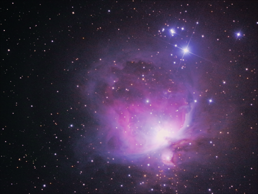 私が M42 をみて感じるのは画像の下に少し屈曲した明るい部分が鳥の頭、そして、その上に大きく左右に拡がる部分が鳥の翼、鳥というよりは宇宙を飛ぶ怪鳥?そんなイメージを思い描いています。もちろん写真のように明るく輝くピンク色は、微かに感じるほどでモノクロではないか・・位の色調を感じるのみです。ですが、明るい部分を切り分けるような暗黒物質がつくるコントラストはみることが出来ます。初めて見る方(大人・子供)は、どんな風に感じるのでしょうか?「みえない!」という方が居ないことを願うのみですが、楽しみな不安な一週間が始まります。あとは運を天にまかせるだけ。。宜しくお願いいたします。天の神よ!